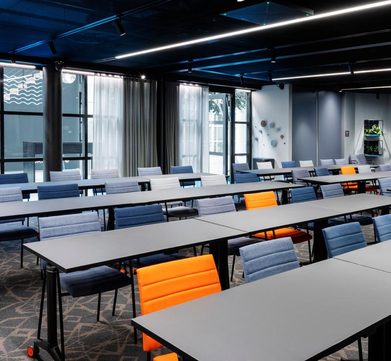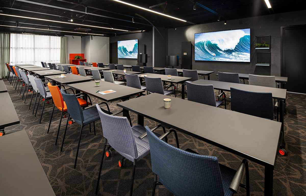 Upplev den dubbla kraften av vatten och vind för att superladda dina möten! Våra Water och Wave rum kan enkelt kombineras till ett större rum med flexibel möblering och flera skärmar, tack vare en skjutvägg.