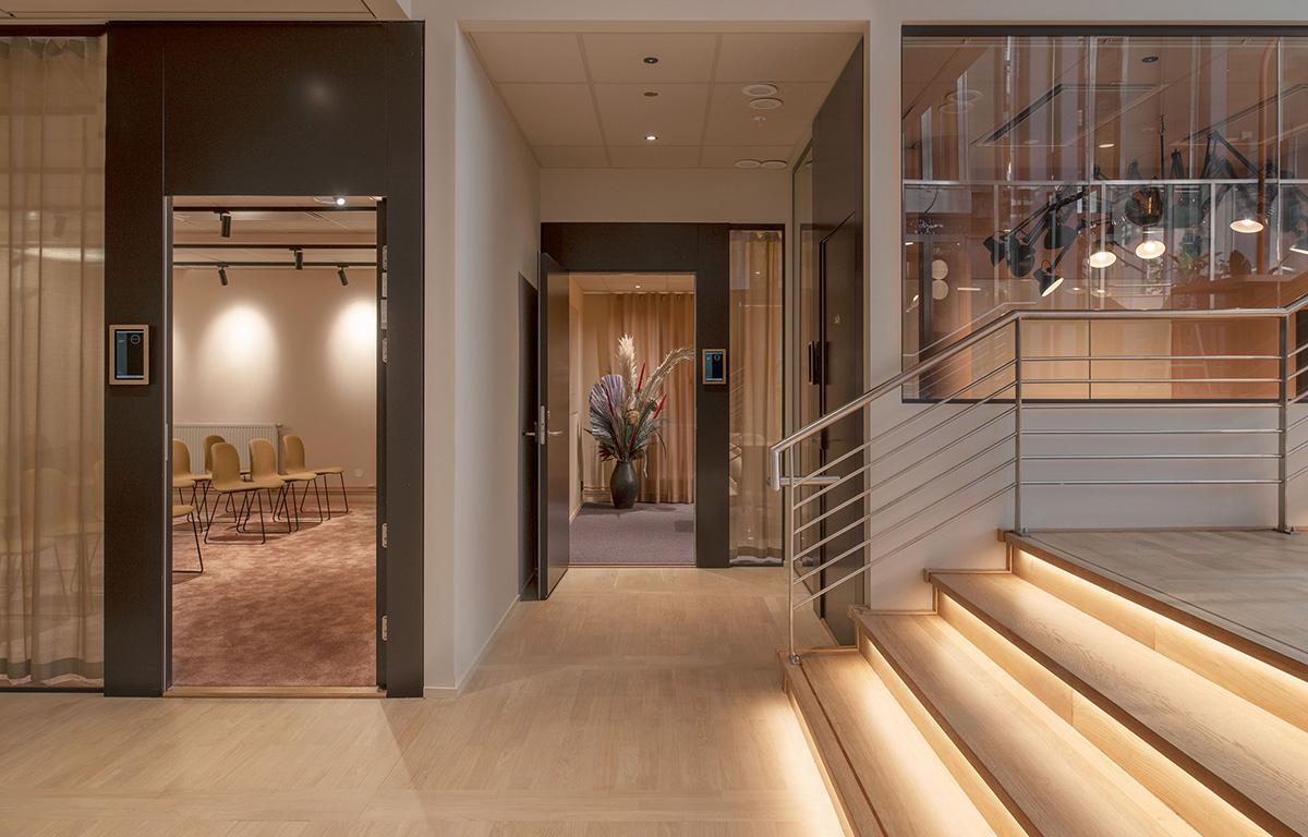 Albert är ett mötesrum som är 100% flexibelt beroende på vad ni ska göra. En yoga-session helt utan stolar, en föreläsning eller en workshop med post-its över hela väggarna – det mesta är möjligt att göra i Albert. Utanför Albert hittar ni generösa lounger och pausytor där ni kan båda jobba i mindre grupper eller bara hämta andan i några minuter över en god och ekologisk kopp med kaffe.